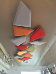 Red Acoustic Ceiling Kites are eye candy that work on correcting noisy rooms. 12 colors and endless configurations gives you freedom to enhance any room. The Red Acoustic Ceiling Kites are shown hanging from a metal frame structure which allows the tiles to be positioned, arranged and rotated to create a beautiful functional design element. We offer consultation on recommended tiles site specific to your room’s dimension and function. Acoustic performance of NRC 1.0 is achieved with an ISO standard of 11654. Low mid and high frequencies are absorbed through the unique shape and construction. The outer surface is a soft looking polyester which is highly durable and easy to clean. The panels are 100% recyclable. No formaldehyde is used. Fire and smoke Class A flame spread and smoke development UL 723 ASTM E 84. Choose from 12 colors. Approximate size is 23″ x 19″, 26″ x 32″. Tiles are easily rotated and tipped. Tiles can be ceiling or wall hung. Additionally a 67″ high free standing totem stand design is offered. Soon to be released LED back lighting! Wow. We love the colors and freedom to create beautiful designs while correcting noise. These are appropriate for every room in office and home. They are eye candy that work to improve your space. Contact Mar to start your quote.